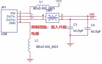 抑制措施:USB 端口的濾波處理-使用共模電感,USB 傳輸線上的信號是差分信號而干擾源是共模干擾信號,在傳輸線上串上共模電感能較好的抑制共模干擾,而對有用的差分信號沒有任何衰減。