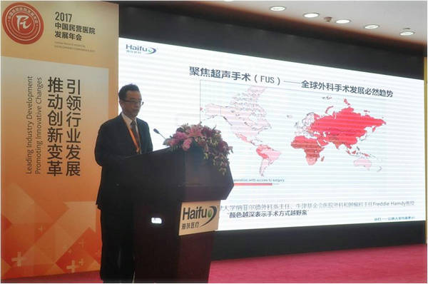 重慶海扶(fu)醫療科技股份(fen)有限公司總經理(li)蔣鋼作為會議最后的(de)發言嘉賓登場。蔣總首(shou)先向大家介(jie)紹了現今世(shi)界外科手(shou)術(shu)(shu)的(de)發展趨勢,由“大創,到微(wei)創,到無(wu)創”的(de)手(shou)術(shu)(shu)方式和理(li)念的(de)轉變已(yi)經不可阻擋。蔣鋼總經理(li)引用了世(shi)界外科手(shou)術(shu)(shu)界排名前三的(de)英國牛津大學Freddy教授的(de)世(shi)界手(shou)術(shu)(shu)趨勢分布圖來(lai)佐(zuo)證。