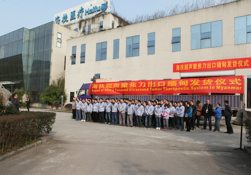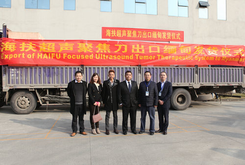 2015年1月13日(ri),在(zai)冬(dong)日(ri)的暖陽中,海(hai)扶(fu)醫(yi)療(liao)進入(ru)緬(mian)甸(dian)的首(shou)臺海(hai)扶(fu)刀®JC型聚焦超聲(sheng)腫(zhong)瘤治療(liao)系(xi)統“整裝”待發。部分海(hai)扶(fu)人,在(zai)明媚的海(hai)扶(fu)園區內(nei)舉行了(le)一場隆重而(er)簡短(duan)的發貨儀式,海(hai)扶(fu)醫(yi)療(liao)在(zai)緬(mian)甸(dian)的合作伙伴黃先(xian)生一行也(ye)出席了(le)這個對他們來(lai)說意義非凡的儀式。