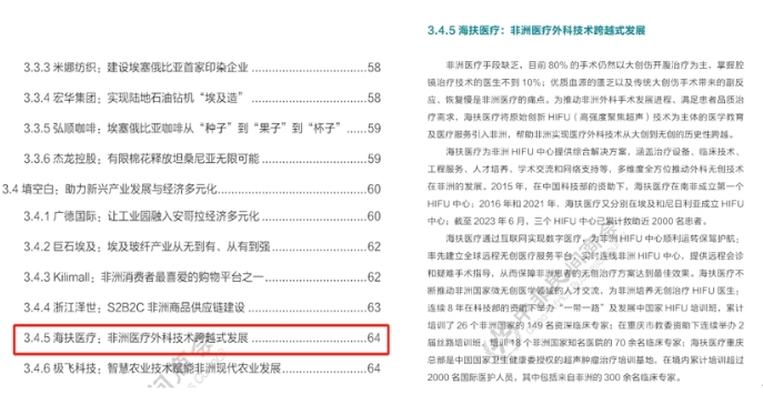 海扶(fu)醫(yi)療在助(zhu)力(li)非(fei)(fei)(fei)洲(zhou)新(xin)興產業發展與經濟多元化(hua)合作中,以原(yuan)始(shi)創(chuang)新(xin)的HIFU技(ji)術(shu)為主(zhu)體及相關(guan)醫(yi)學教育及醫(yi)療服務(wu)引(yin)入非(fei)(fei)(fei)洲(zhou),幫助(zhu)非(fei)(fei)(fei)洲(zhou)實現(xian)外科手術(shu)從大(da)(da)創(chuang)到無(wu)創(chuang)的偉大(da)(da)跨越,其(qi)歷史意義重大(da)(da),海扶(fu)醫(yi)療非(fei)(fei)(fei)洲(zhou)相關(guan)項目(mu)被入編(bian)《中國企業投資非(fei)(fei)(fei)洲(zhou)報告2023》。
