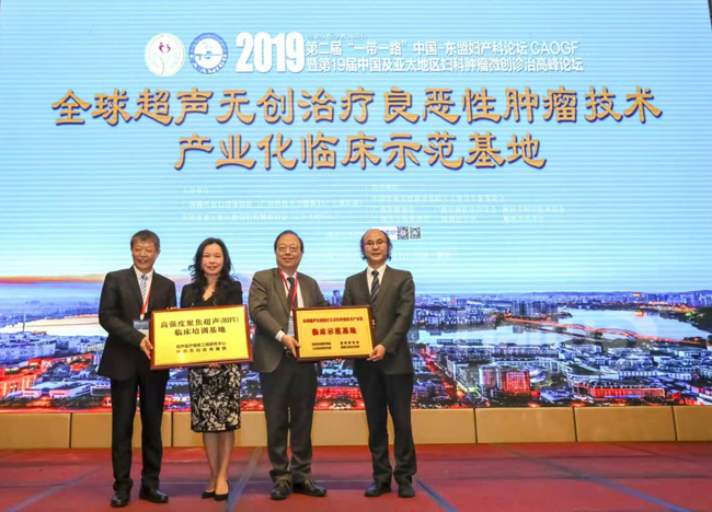 中國亞太地區微創婦科腫瘤協會Felix Wong主席、重慶醫科大學王智彪教授為廣西柳州市婦幼保健院成為全球超聲無創治療良惡性腫瘤技術產業化臨床示范基地、高強度聚焦超聲(HIFU)培訓基地授牌。