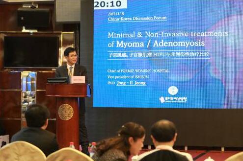 韓國FORMIZ女性醫院鄭鍾逸院長介紹了韓國盆腔 出的子宮肌瘤及子宮腺肌病的診斷率(子宮肌瘤20%,子宮腺肌病12%,子宮肌瘤合并子宮腺肌病3.1%)。指出癥狀有無與患者的治療相關,應根據其進行個性化治療方法的規劃。然后對最小侵入性治療子宮腫瘤消融手術、非侵入性(非創傷性)治療HIFU、增進HIFU效果的并行治療進行了詳細的闡釋,讓在場嘉賓對韓國HIFU的應用及開展情況有了更深入的了解。