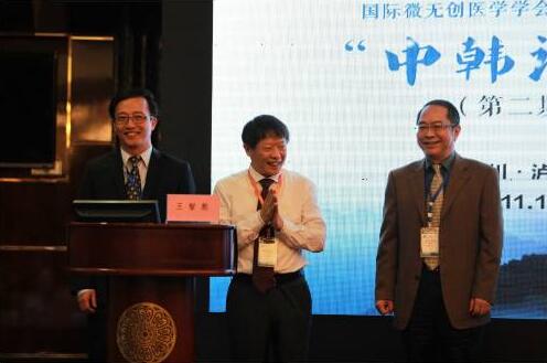 超聲醫療國家工程研究中心王智彪主任致辭,中韓論道,論什么道呢?論微無創醫學之道。在聚焦超聲領域,我們剛開始,希望大家團結起來,為醫學進步做一點貢獻。雖然在醫學領域,我們占的比重還很小,但大家一起努力,不會孤單。之后,王教授和陳文直教授、張煉教授一起向在場嘉賓表示感謝,希望通過這項技術,和大家越走越近。