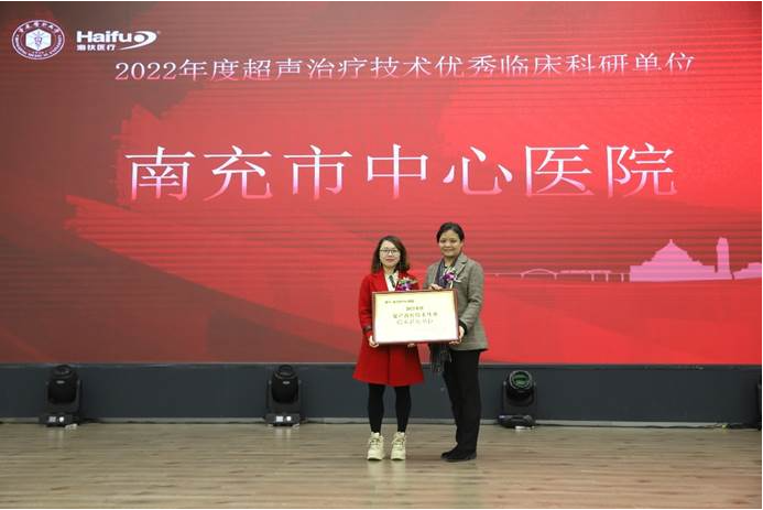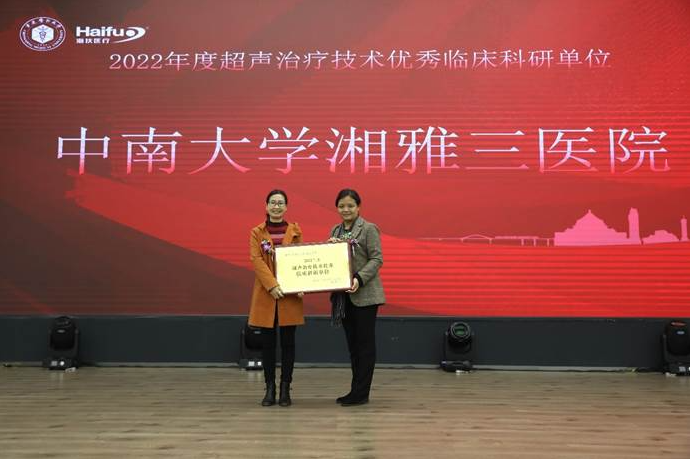 五家海扶刀?設備臨床應用單(dan)位(wei)獲(huo)(huo)“超(chao)(chao)聲(sheng)治(zhi)(zhi)療(liao)技(ji)術優秀臨床科研單(dan)位(wei)”獎(jiang)項,他們在開展超(chao)(chao)聲(sheng)治(zhi)(zhi)療(liao)技(ji)術相關(guan)國重(zhong)開放課題、各級課題、論文發表(biao)等(deng)方面名列前(qian)茅,分別是:綿陽市(shi)中(zhong)(zhong)(zhong)(zhong)心(xin)醫(yi)院、遂寧市(shi)中(zhong)(zhong)(zhong)(zhong)心(xin)醫(yi)院、遂寧市(shi)中(zhong)(zhong)(zhong)(zhong)醫(yi)院、南(nan)充(chong)市(shi)中(zhong)(zhong)(zhong)(zhong)心(xin)醫(yi)院和(he)中(zhong)(zhong)(zhong)(zhong)南(nan)大(da)學湘雅三醫(yi)院,由超(chao)(chao)聲(sheng)醫(yi)學工(gong)程國家重(zhong)點(dian)實驗室副主任石丘(qiu)玲教授為獲(huo)(huo)獎(jiang)單(dan)位(wei)頒獎(jiang)。