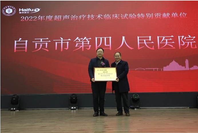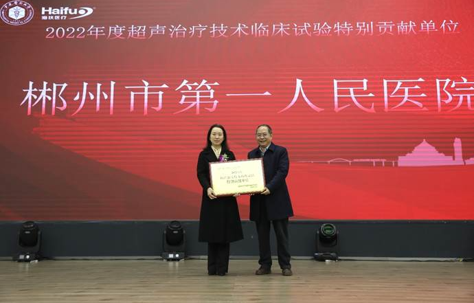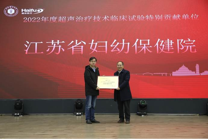 共九家海扶刀?設備臨床(chuang)應(ying)用單位獲“超(chao)聲治(zhi)療技(ji)術(shu)臨床(chuang)試驗特(te)別貢(gong)(gong)獻單位”獎項(xiang),他們(men)在(zai)超(chao)聲治(zhi)療技(ji)術(shu)臨床(chuang)適應(ying)癥拓(tuo)展、項(xiang)目合作(zuo)等方(fang)面做出了特(te)別貢(gong)(gong)獻,分別是:自貢(gong)(gong)市第四人民醫(yi)(yi)院(yuan)、遂寧市中心醫(yi)(yi)院(yuan)、江(jiang)蘇省(sheng)婦(fu)幼保健(jian)院(yuan)、湖南(nan)省(sheng)婦(fu)幼保健(jian)院(yuan)、郴州(zhou)市第一(yi)人民醫(yi)(yi)院(yuan)、遵義醫(yi)(yi)科大學(xue)附屬(shu)(shu)醫(yi)(yi)院(yuan)、四川省(sheng)婦(fu)幼保健(jian)院(yuan)、川北(bei)醫(yi)(yi)學(xue)院(yuan)附屬(shu)(shu)醫(yi)(yi)院(yuan)和中南(nan)大學(xue)湘雅(ya)三醫(yi)(yi)院(yuan),由超(chao)聲醫(yi)(yi)學(xue)工程(cheng)國家重點實(shi)驗室(shi)陳文直教授為獲獎單位頒獎。