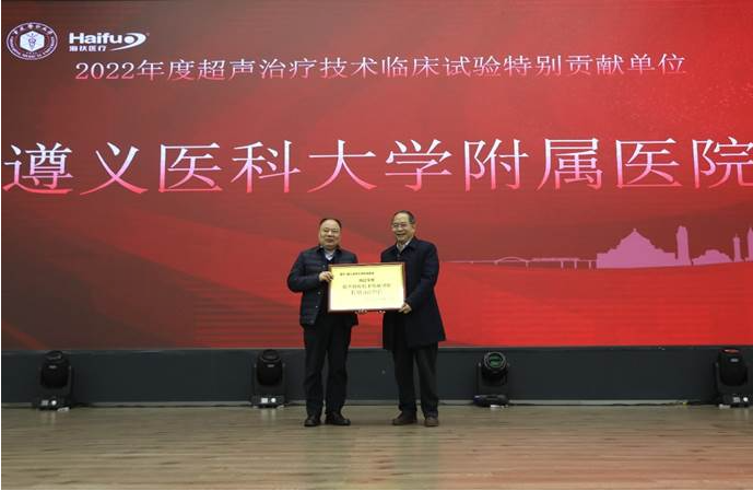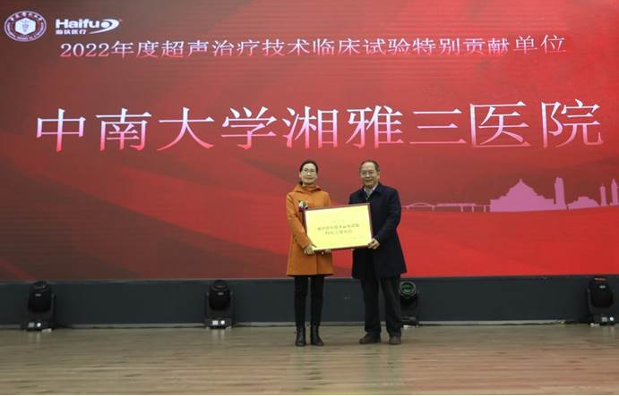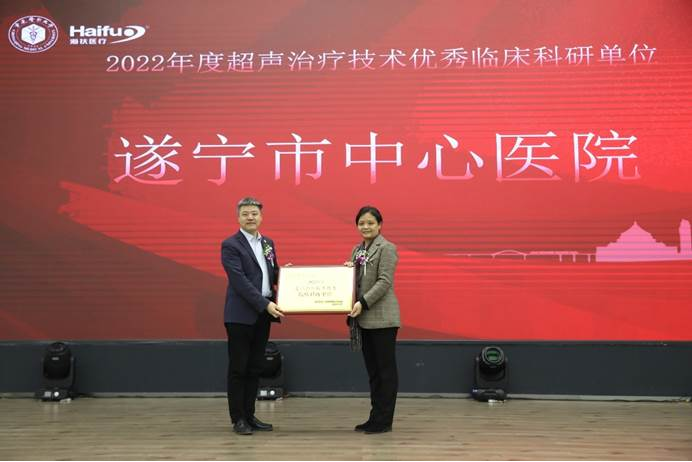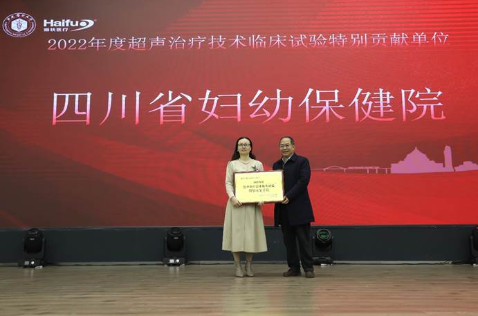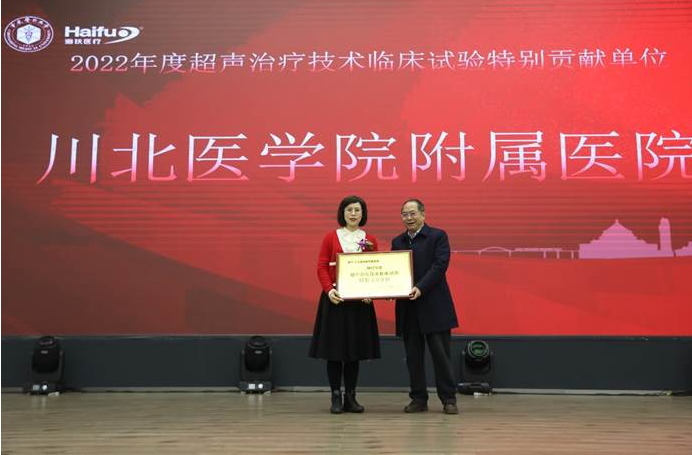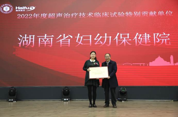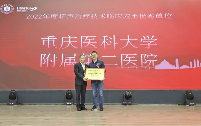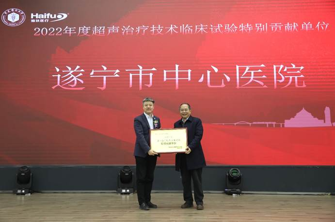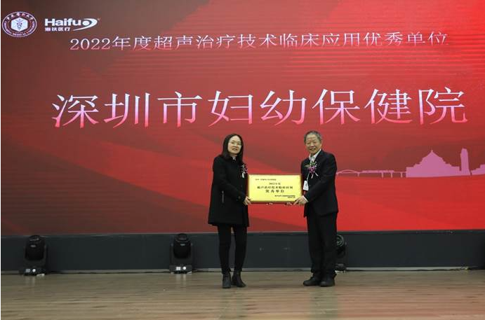 2022年海扶刀(dao)?設備(bei)臨床治(zhi)療(liao)(liao)量全國排(pai)名前十的臨床應用單(dan)位(wei)獲(huo)得“超聲治(zhi)療(liao)(liao)技術臨床應用優秀單(dan)位(wei)”獎(jiang)項,分別是:重慶(qing)海扶醫(yi)(yi)院(yuan)(yuan)(yuan)、中(zhong)南大(da)學(xue)湘雅三醫(yi)(yi)院(yuan)(yuan)(yuan)、遂寧(ning)市(shi)中(zhong)心醫(yi)(yi)院(yuan)(yuan)(yuan)、重慶(qing)醫(yi)(yi)科大(da)學(xue)附屬(shu)二院(yuan)(yuan)(yuan)、遵義醫(yi)(yi)科大(da)學(xue)附屬(shu)醫(yi)(yi)院(yuan)(yuan)(yuan)、佛(fo)山市(shi)婦幼(you)保(bao)(bao)健(jian)院(yuan)(yuan)(yuan)、綿陽(yang)市(shi)中(zhong)心醫(yi)(yi)院(yuan)(yuan)(yuan)、深圳市(shi)婦幼(you)保(bao)(bao)健(jian)院(yuan)(yuan)(yuan)、石家莊(zhuang)市(shi)婦產(chan)醫(yi)(yi)院(yuan)(yuan)(yuan)、川北醫(yi)(yi)學(xue)院(yuan)(yuan)(yuan)附屬(shu)醫(yi)(yi)院(yuan)(yuan)(yuan),由(you)超聲醫(yi)(yi)學(xue)工程國家重點實驗室主任王(wang)智(zhi)彪教授為獲(huo)獎(jiang)單(dan)位(wei)頒獎(jiang)。