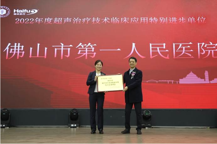 佛山市第(di)一人民醫(yi)院是2022年治(zhi)療(liao)量進步(bu)最(zui)大的(de)海扶刀(dao)?設備臨床應用單(dan)位,創造(zao)了(le)治(zhi)療(liao)量由2021年的(de)120例到(dao)2022年達(da)到(dao)420例的(de)優秀成績(ji),獲(huo)“超(chao)聲治(zhi)療(liao)技術臨床應用特(te)別進步(bu)單(dan)位”獎(jiang)項,由超(chao)聲醫(yi)療(liao)國家工程(cheng)研究中心首席(xi)運營官楊興旌(jing)為獲(huo)獎(jiang)單(dan)位頒獎(jiang)。