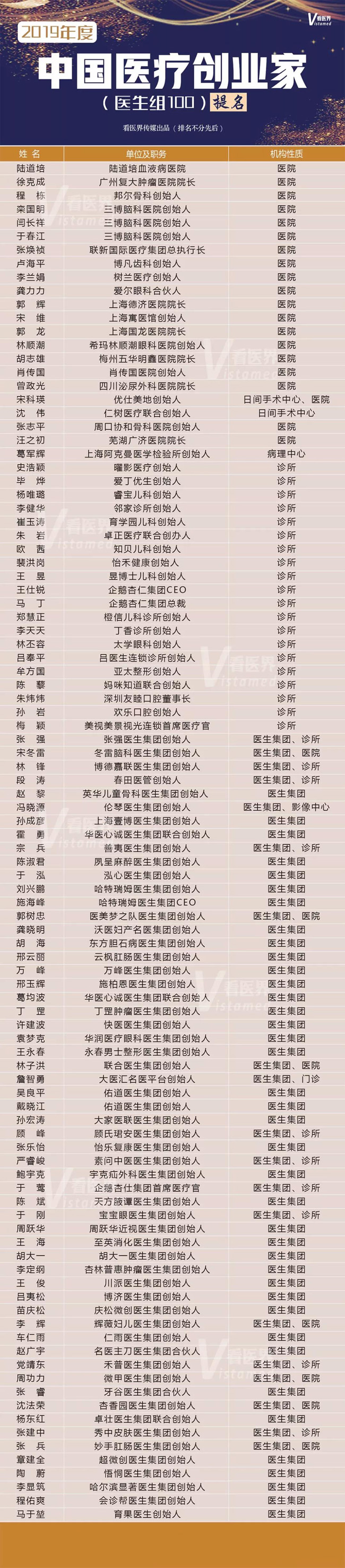 [看醫界]搶先看“2019年度中國醫療創業家(醫生組100)提名”